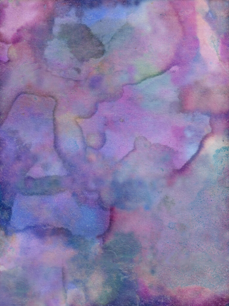 Case in point, the image presented here, Bruised Twilight, was a scrap of note paper with which I soaked up excess inks from a project. As I looked at the scrap after it had thoroughly dried, I was struck with its beauty. The original piece was lined, so there has been some extensive editing of this final image.
